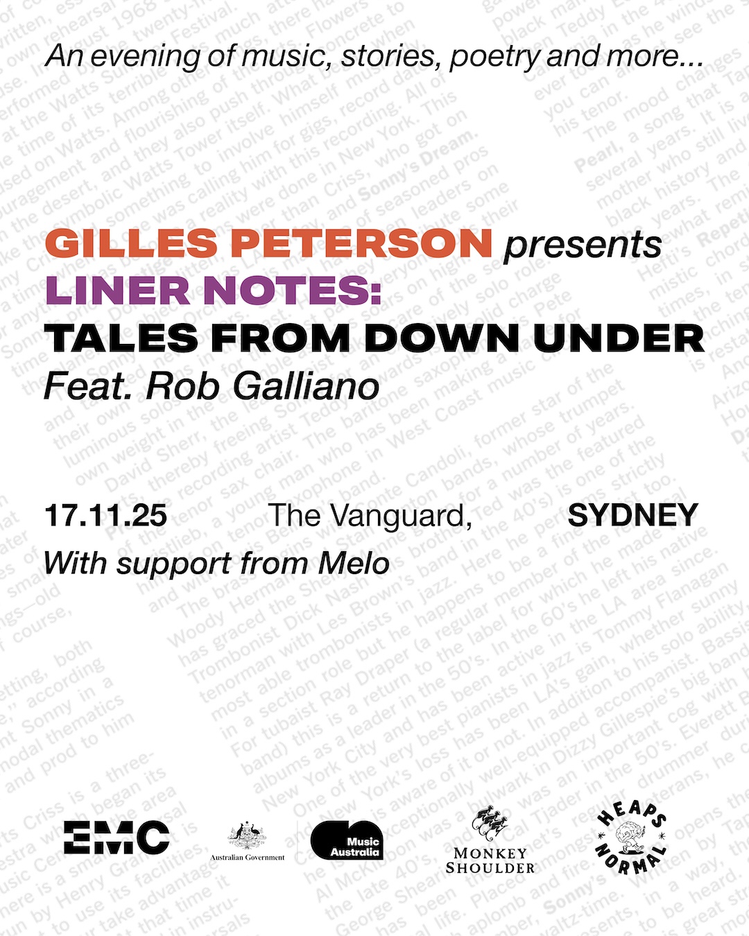 Gilles Peterson presents Liner Notes: Tales from Down Under is presented with the support of friends of culture Monkey Shoulder and Heaps Normal. EMC’s initiatives and programs are supported by the Australian Government through Music Australia.